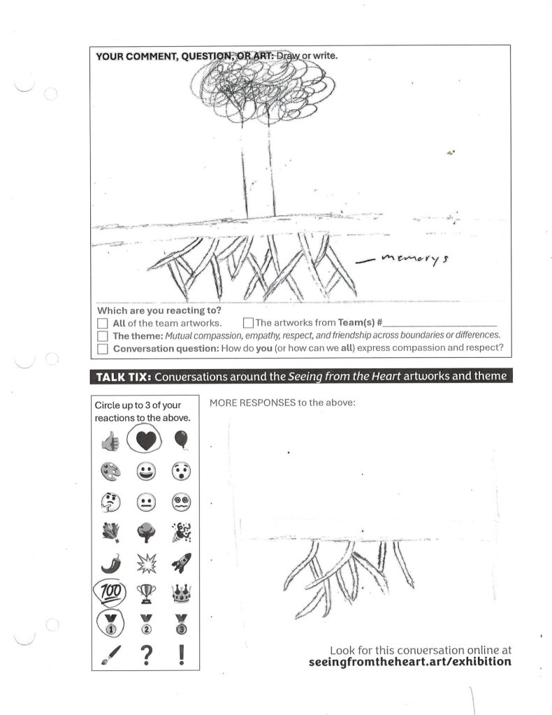 Home > Talk Tix Talk Tix 12 “Memorys.” Your reaction to this TALK TIX: Add your own TALK TIX: Create your TALK TIX *Draw your response. This might work best on your laptop computer or desktop computer. (Draw at least 1 mark before you can submit this TALK TIX.) Clear (Optional.) Write your question or comment: *This TALK TIX is your reaction to: The TALK TIX at the top of this pageALL of the team artworksThe patchwork/collage by TEAM 1The patchwork/collage by TEAM 2The patchwork/collage by TEAM 3The mobile by TEAM 4The patchwork/collage by TEAM 5The patchwork/collage by TEAM 6The patchwork/collage by TEAM 7The mobile by TEAM 8The mobile by TEAM 9The patchwork/collage by TEAM 10The patchwork/collage by TEAM 11The mobiles by FOREST ST SCHOOL studentsThe THEME: Mutual compassion, empathy, respect, and friendship across boundaries or differencesConversation QUESTION: How do you express compassion and respect? Please leave this field empty. See more TALK TIX Prev Post Talk Tix 11 Next Post Talk Tix 13