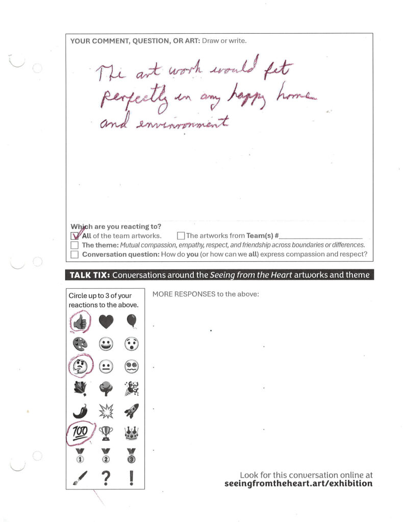 Home > ALL teams / Talk Tix Talk Tix 13 “The art work would fit perfectly in any happy home and environment.” Your reaction to this TALK TIX: Add your own TALK TIX: Create your TALK TIX *Draw your response. This might work best on your laptop computer or desktop computer. (Draw at least 1 mark before you can submit this TALK TIX.) Clear (Optional.) Write your question or comment: *This TALK TIX is your reaction to: The TALK TIX at the top of this pageALL of the team artworksThe patchwork/collage by TEAM 1The patchwork/collage by TEAM 2The patchwork/collage by TEAM 3The mobile by TEAM 4The patchwork/collage by TEAM 5The patchwork/collage by TEAM 6The patchwork/collage by TEAM 7The mobile by TEAM 8The mobile by TEAM 9The patchwork/collage by TEAM 10The patchwork/collage by TEAM 11The mobiles by FOREST ST SCHOOL studentsThe THEME: Mutual compassion, empathy, respect, and friendship across boundaries or differencesConversation QUESTION: How do you express compassion and respect? Please leave this field empty. See more TALK TIX Prev Post Talk Tix 12 Next Post Talk Tix 14