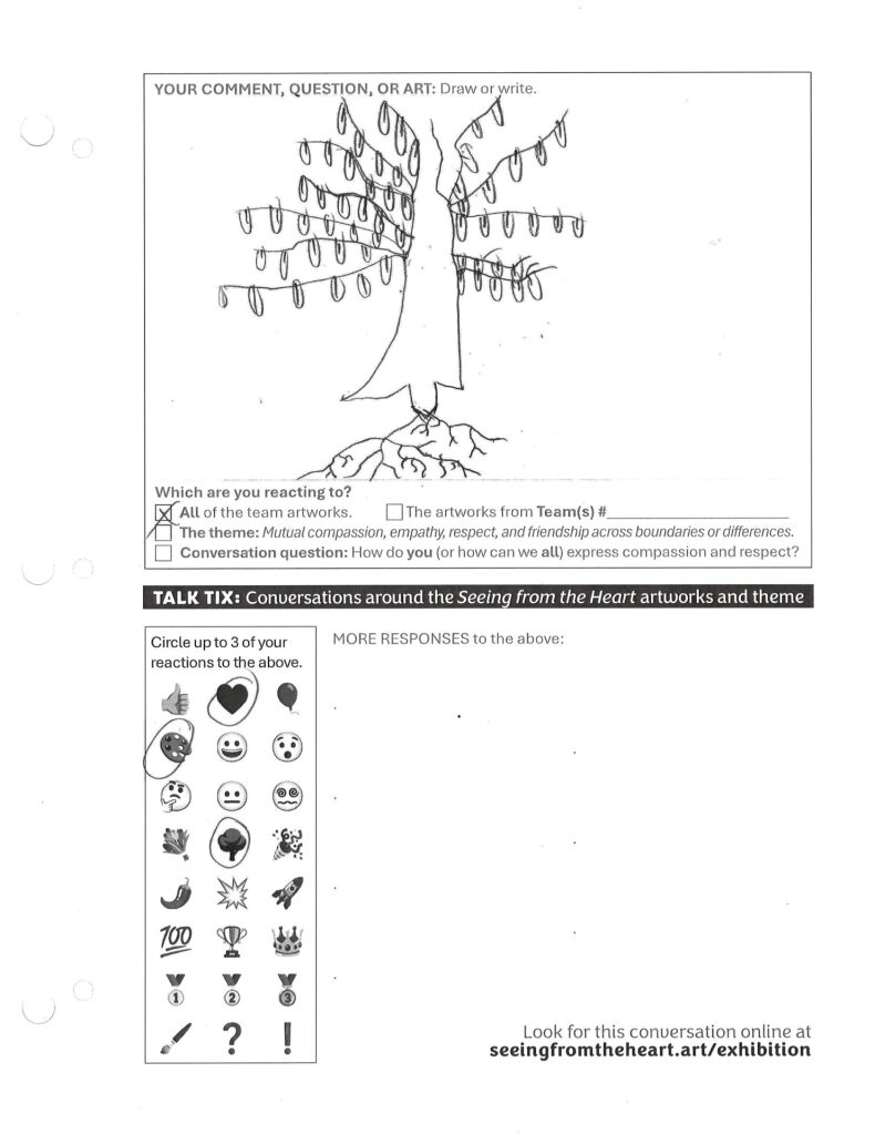 Home > ALL teams / Talk Tix Talk Tix 21 (drawing) Your reaction to this TALK TIX: Add your own TALK TIX: Create your TALK TIX *Draw your response. This might work best on your laptop computer or desktop computer. (Draw at least 1 mark before you can submit this TALK TIX.) Clear (Optional.) Write your question or comment: *This TALK TIX is your reaction to: The TALK TIX at the top of this pageALL of the team artworksThe patchwork/collage by TEAM 1The patchwork/collage by TEAM 2The patchwork/collage by TEAM 3The mobile by TEAM 4The patchwork/collage by TEAM 5The patchwork/collage by TEAM 6The patchwork/collage by TEAM 7The mobile by TEAM 8The mobile by TEAM 9The patchwork/collage by TEAM 10The patchwork/collage by TEAM 11The mobiles by FOREST ST SCHOOL studentsThe THEME: Mutual compassion, empathy, respect, and friendship across boundaries or differencesConversation QUESTION: How do you express compassion and respect? Please leave this field empty. See more TALK TIX Prev Post Talk Tix 20 Next Post Talk Tix 22