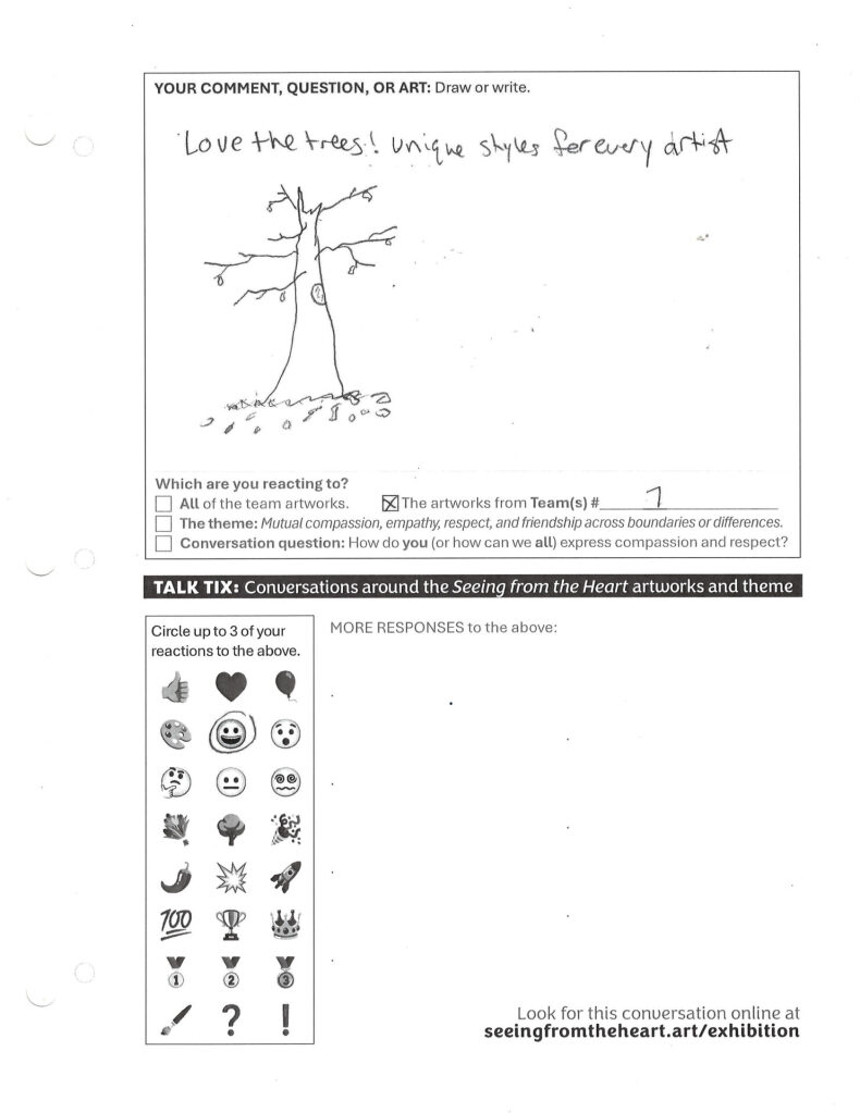 Home > Talk Tix / Team 7 Talk Tix 22 “Love the trees! Unique styles for every artist.” Your reaction to this TALK TIX: Add your own TALK TIX: Create your TALK TIX *Draw your response. This might work best on your laptop computer or desktop computer. (Draw at least 1 mark before you can submit this TALK TIX.) Clear (Optional.) Write your question or comment: *This TALK TIX is your reaction to: The TALK TIX at the top of this pageALL of the team artworksThe patchwork/collage by TEAM 1The patchwork/collage by TEAM 2The patchwork/collage by TEAM 3The mobile by TEAM 4The patchwork/collage by TEAM 5The patchwork/collage by TEAM 6The patchwork/collage by TEAM 7The mobile by TEAM 8The mobile by TEAM 9The patchwork/collage by TEAM 10The patchwork/collage by TEAM 11The mobiles by FOREST ST SCHOOL studentsThe THEME: Mutual compassion, empathy, respect, and friendship across boundaries or differencesConversation QUESTION: How do you express compassion and respect? Please leave this field empty. See more TALK TIX Prev Post Talk Tix 21 Next Post Talk Tix 23