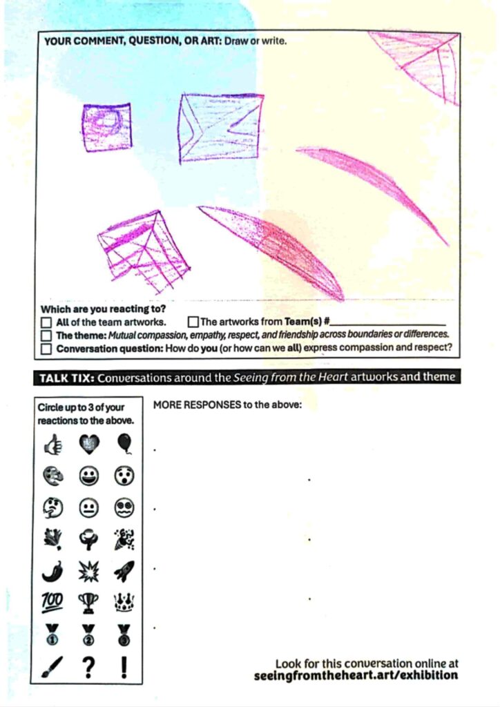 Home > Talk Tix Talk Tix 26 (drawing) Your reaction to this TALK TIX: Add your own TALK TIX: Create your TALK TIX *Draw your response. This might work best on your laptop computer or desktop computer. (Draw at least 1 mark before you can submit this TALK TIX.) Clear (Optional.) Write your question or comment: *This TALK TIX is your reaction to: The TALK TIX at the top of this pageALL of the team artworksThe patchwork/collage by TEAM 1The patchwork/collage by TEAM 2The patchwork/collage by TEAM 3The mobile by TEAM 4The patchwork/collage by TEAM 5The patchwork/collage by TEAM 6The patchwork/collage by TEAM 7The mobile by TEAM 8The mobile by TEAM 9The patchwork/collage by TEAM 10The patchwork/collage by TEAM 11The mobiles by FOREST ST SCHOOL studentsThe THEME: Mutual compassion, empathy, respect, and friendship across boundaries or differencesConversation QUESTION: How do you express compassion and respect? Please leave this field empty. See more TALK TIX Prev Post Talk Tix 25 Next Post Talk Tix 27