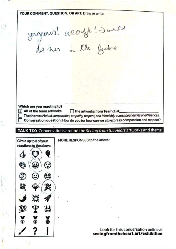 Home > ALL teams / Talk Tix Talk Tix 28 “gorgeous! colorful! I would do this in the future.” Your reaction to this TALK TIX: Add your own TALK TIX: Create your TALK TIX *Draw your response. This might work best on your laptop computer or desktop computer. (Draw at least 1 mark before you can submit this TALK TIX.) Clear (Optional.) Write your question or comment: *This TALK TIX is your reaction to: The TALK TIX at the top of this pageALL of the team artworksThe patchwork/collage by TEAM 1The patchwork/collage by TEAM 2The patchwork/collage by TEAM 3The mobile by TEAM 4The patchwork/collage by TEAM 5The patchwork/collage by TEAM 6The patchwork/collage by TEAM 7The mobile by TEAM 8The mobile by TEAM 9The patchwork/collage by TEAM 10The patchwork/collage by TEAM 11The mobiles by FOREST ST SCHOOL studentsThe THEME: Mutual compassion, empathy, respect, and friendship across boundaries or differencesConversation QUESTION: How do you express compassion and respect? Please leave this field empty. See more TALK TIX Prev Post Talk Tix 27 Next Post Talk Tix 29