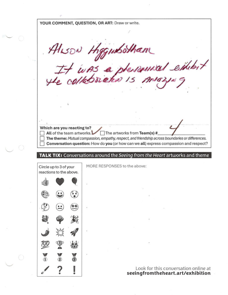 Home > Talk Tix / Team 4 Talk Tix 4 “It was a phenomenal exhibit. The collaboration is amazing.” Your reaction to this TALK TIX: Add your own TALK TIX: Create your TALK TIX *Draw your response. This might work best on your laptop computer or desktop computer. (Draw at least 1 mark before you can submit this TALK TIX.) Clear (Optional.) Write your question or comment: *This TALK TIX is your reaction to: The TALK TIX at the top of this pageALL of the team artworksThe patchwork/collage by TEAM 1The patchwork/collage by TEAM 2The patchwork/collage by TEAM 3The mobile by TEAM 4The patchwork/collage by TEAM 5The patchwork/collage by TEAM 6The patchwork/collage by TEAM 7The mobile by TEAM 8The mobile by TEAM 9The patchwork/collage by TEAM 10The patchwork/collage by TEAM 11The mobiles by FOREST ST SCHOOL studentsThe THEME: Mutual compassion, empathy, respect, and friendship across boundaries or differencesConversation QUESTION: How do you express compassion and respect? Please leave this field empty. See more TALK TIX Prev Post Talk Tix 3 Next Post Talk Tix 5