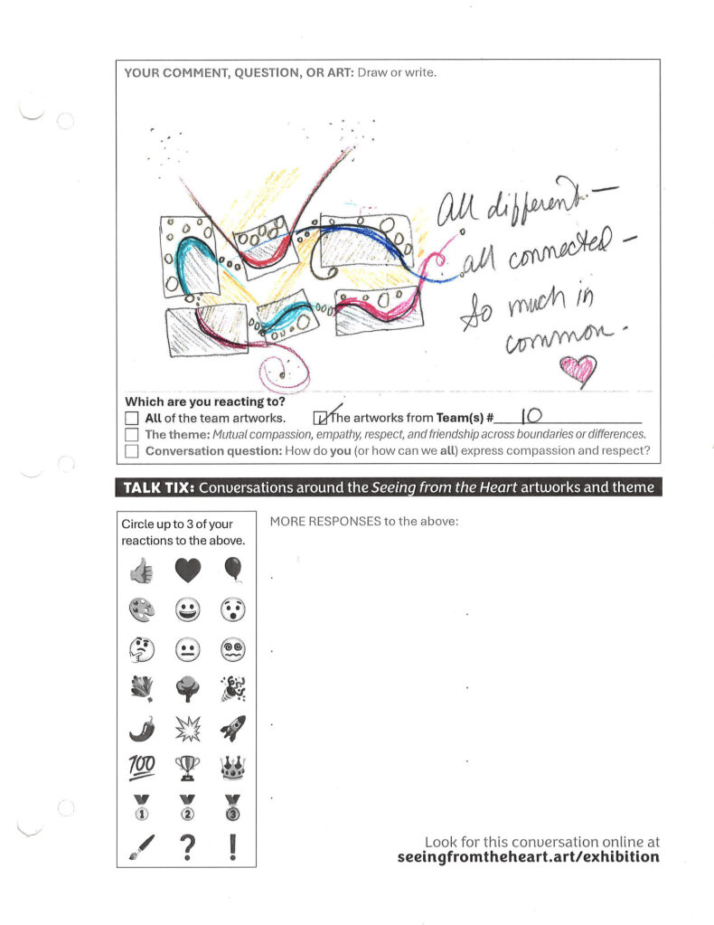 Home > Talk Tix / Team 10 Talk Tix 8 “All different – all connected – So much in common.” Your reaction to this TALK TIX: Add your own TALK TIX: Create your TALK TIX *Draw your response. This might work best on your laptop computer or desktop computer. (Draw at least 1 mark before you can submit this TALK TIX.) Clear (Optional.) Write your question or comment: *This TALK TIX is your reaction to: The TALK TIX at the top of this pageALL of the team artworksThe patchwork/collage by TEAM 1The patchwork/collage by TEAM 2The patchwork/collage by TEAM 3The mobile by TEAM 4The patchwork/collage by TEAM 5The patchwork/collage by TEAM 6The patchwork/collage by TEAM 7The mobile by TEAM 8The mobile by TEAM 9The patchwork/collage by TEAM 10The patchwork/collage by TEAM 11The mobiles by FOREST ST SCHOOL studentsThe THEME: Mutual compassion, empathy, respect, and friendship across boundaries or differencesConversation QUESTION: How do you express compassion and respect? Please leave this field empty. See more TALK TIX Prev Post Talk Tix 7 Next Post Talk Tix 9